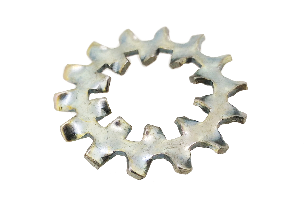 丸いワッシャーの内側と外側に、歯車のように凸凹した歯が付き、少しねじれて立ち上がっているような形状です。 「歯付き座金」、「菊座金」 とも呼びます。