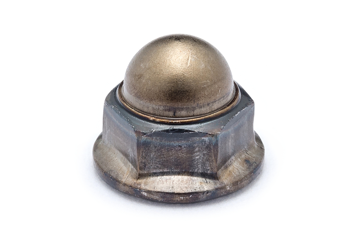 六角ナットの片面に、ドーム形の金属が被さっているため、ボルトなどのねじ部が露出せず、見た目が良く、安全性も向上。 また、反対側には二面幅より大きい座面が付き、座面裏にはギザギザのセレートが付いているため、緩み止め効果が向上する。