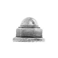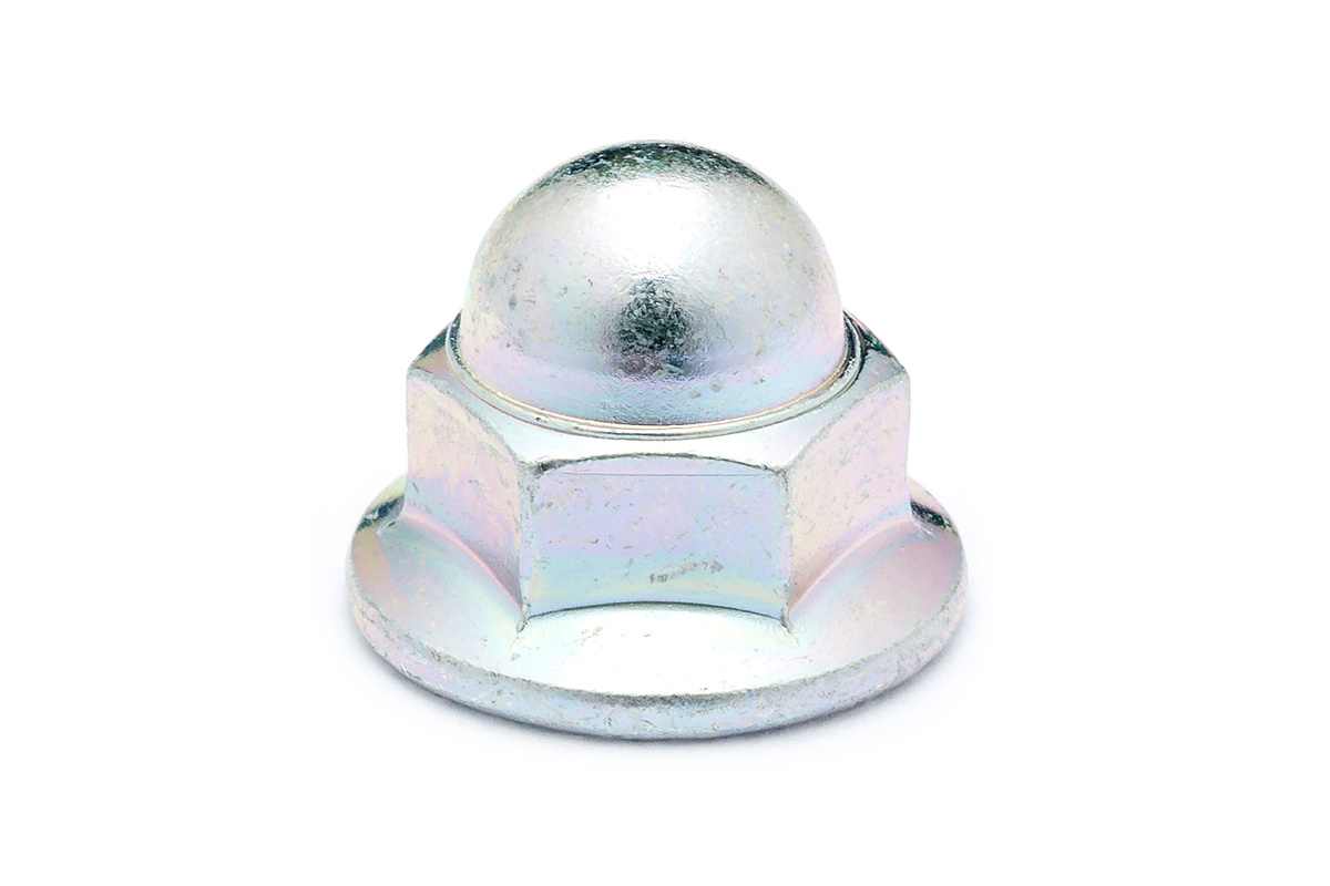 六角ナットの片面に、ドーム形の金属が被さっているため、ボルトなどのねじ部が露出せず、見た目が良く、安全性も向上。 また、反対側には二面幅より大きい座面が付き、座面裏にはギザギザのセレートが付いているため、緩み止め効果が向上する。