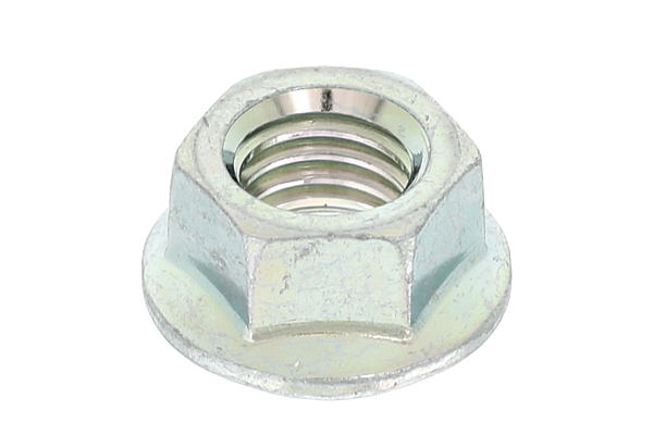 六角ナットの片面に、二面幅より大きい座面が付き、座面裏にギザギザしたセレートが付いたナット。