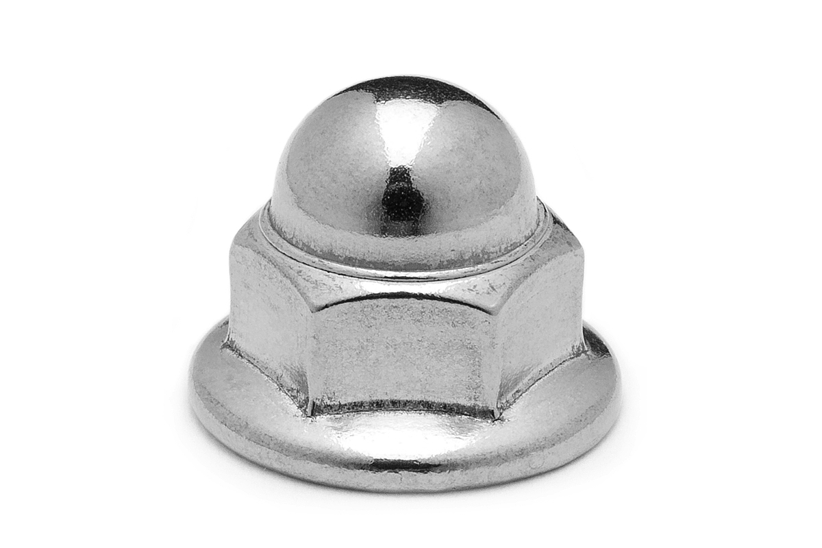 六角ナットの片面に、ドーム形の金属が被さっているため、ボルトなどのねじ部が露出せず、見た目が良く、安全性も向上。 また、反対側には二面幅より大きい座面が付いているため、締め付け強度が増し、緩み止め効果が発生する。
