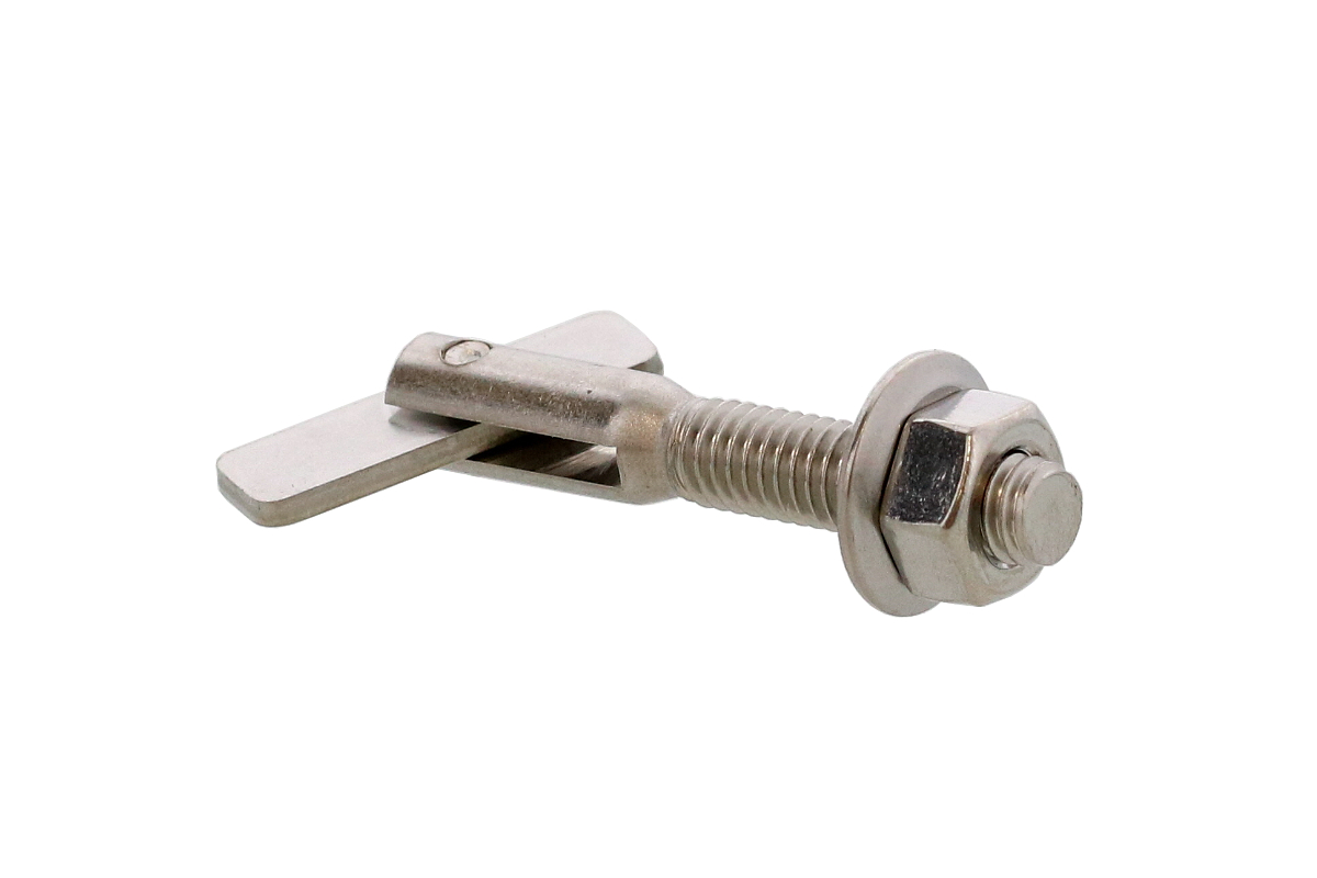 下穴にアンカーを挿入し、壁の内側でロールプレートが回転してストッパーとなります。 その後、取付部材をナットで締め付けて固定します。