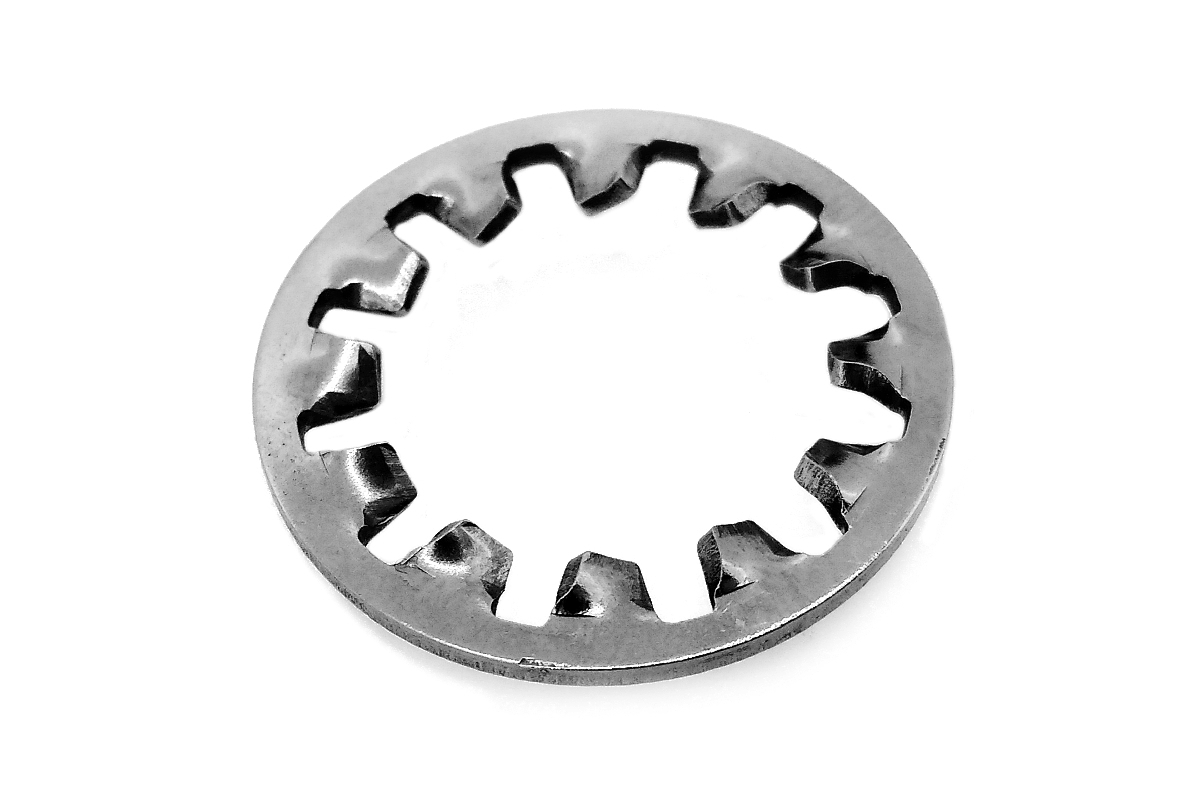 丸いワッシャーの内側に、歯車のように凸凹した歯が付き、少しねじれて立ち上がっているような形状です。 「歯付き座金」、「菊座金」 とも呼びます。