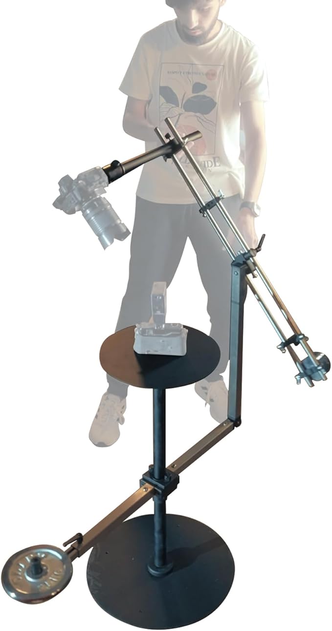 撮影角度と距離は調整可能:350mmロッド1本で、上部の円形ベースプレートと比較してカメラの相対高さを0〜350mmの範囲で調整でき、カメラ角度も調整可能です。 カメラと被写体の間の距離は調整可能で、背景/カウンターウェイトと被写体の間の距離も調整可能です。