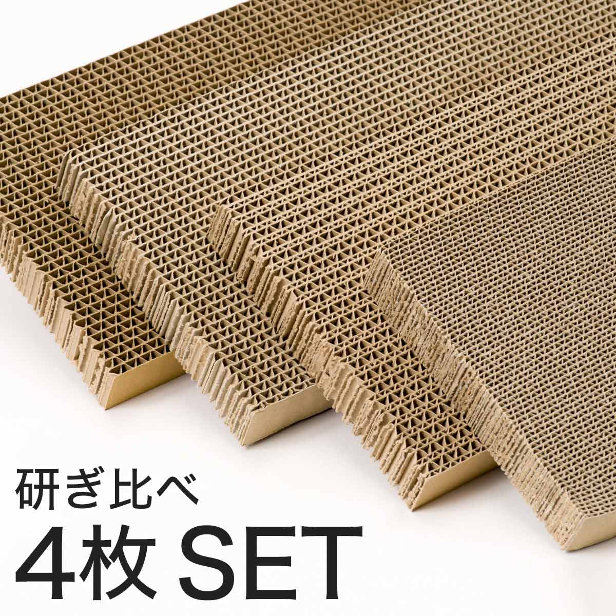 | 岩手の木工職人が一つ一つ丁寧に組み木の技法で組み上げた爪とぎがりがりボード(GarigariBOARD)専用の爪とぎです。摩擦が少なく長く使えるオリジナルのダンボールリフィルをご用意いたしました。粗め、細かめ、ミックス(粗め+細かめ)、柔らかめ(ソフトタイプ)の各1枚ずつ合計4枚のセットです。 |