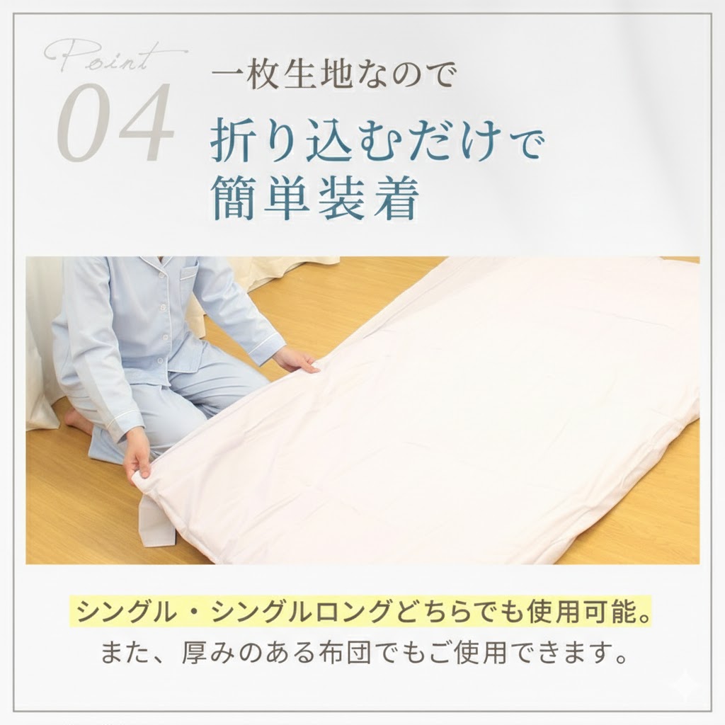 1枚生地でシングル・シングルロングの敷き布団に使用可能。フラットシーツなので、周囲を折り込むだけで簡単に装着ができます。