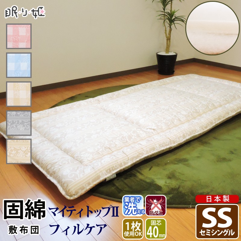 | ・40mmポリエステル固芯入なので、床付感なく1枚でご使用いただけます。 ・コインランドリーで洗濯できるので、清潔に使用していただけます。 ・「乾きやすい生地」、「洗っても固まらずふわふわな抗菌防臭防ダニ仕様の中綿」、洗いにこだわった敷布団です。 ・ほこりが出にくい合繊ワタ入です。ぜん息やアレルギー体質の方におすすめです。 〜縫製から加工まで眠り姫で行っております。〜 |
