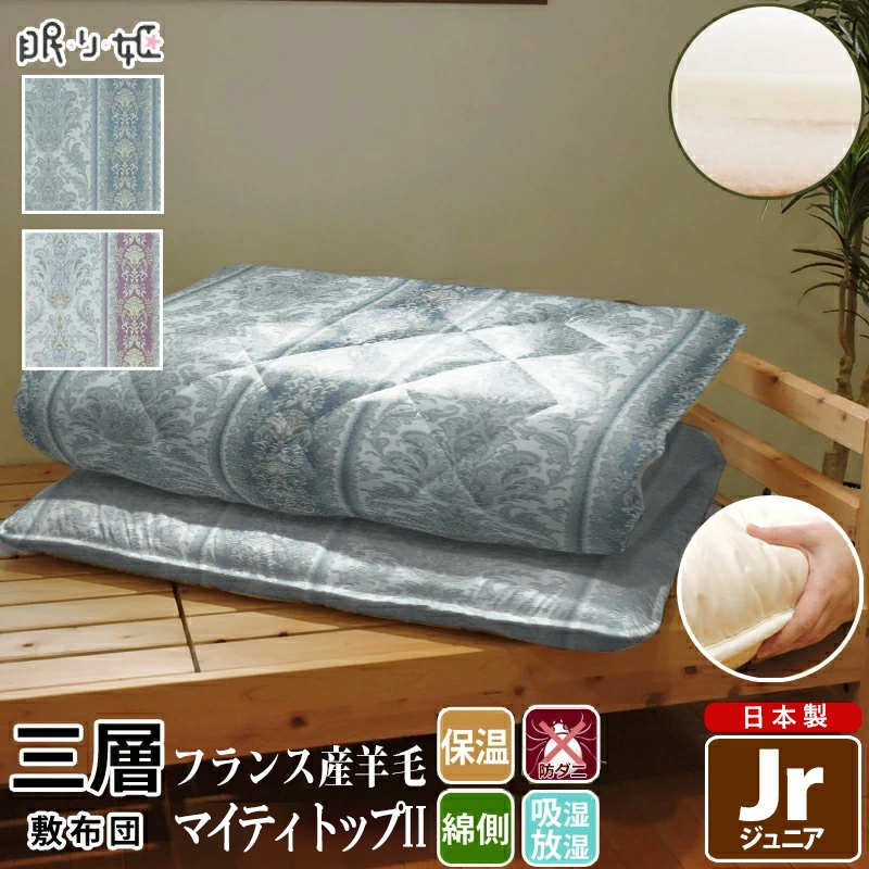 | 【サイズ】85×185cm(ジュニア) ※カバーサイズ(当社カバー):90×190cm 【生地】綿100%(200本ブロード) 【中綿】フランス産羊毛50%・抗菌防臭防ダニ(帝人マイティトップ)ポリエステル50% 【中芯】ポリエステル固芯40mm 【充填物量】約3.3kg 【製品総重量】約3.9kg 【厚み】約8cm 【原産国】日本製 |