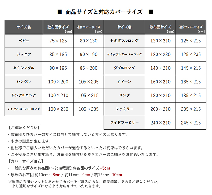 | 【カットサンプル】 ・できるだけ実物と同じ色合いになるようにしていますが、モニターの環境上実物と色合いが異なる場合がございます。ご心配な場合は、色カット(小)サンプルを無料で送らせていただきます。ご連絡お願いします。 ・中素材についても、カット(小)サンプルをお送りいたします。送料はお客様のご負担となり着払いで発送をさせていただきます。ご了承くださいませ。ご入用の場合はご連絡お願いします。 【お願い】 ・仕上がりサイズ・厚み・製品総重量等は、おおよその数字です。お布団の性質上、確定の数字ではございません。ご了承願います。 ・商品は、小さく圧縮して梱包し送らせていただいています。届き次第の開封をお願いします。 ・ご注文いただいてから、加工いたします。お届けまで、お時間をいただく場合もございます。心をこめておつくり致します。できあがりまでお待ちくださいませ。 ・弊社による商品の不備がある場合は、返品お受けいたします。が、イメージとちがう、サイズを間違えた、モニターと色が違う等のお客様都合による返品交換はお受けできません。 ご購入前にご不明な点やご不安な事については、当ショップでにご連絡の上、ご相談、確認くださいませ。 上記の内容をご理解、ご了承の上、お買い求めくださいますようお願いいたします。 |