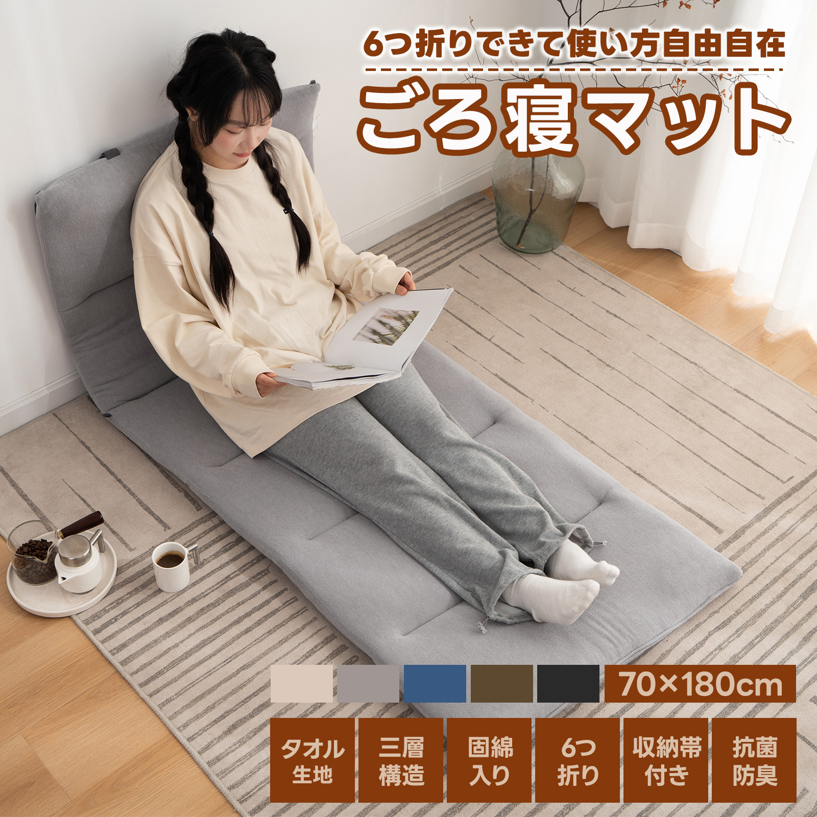 【1000円クーポン】ごろ寝布団 マット ごろ寝マット 68×180cm 6つ折り 折りたたみ タオル生地 長座布団 ごろ寝布団 ごろね おひるね ロングシート コンパクト