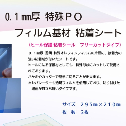ヒール保護シールとして使用しているシートです。 ヒールの形が合わなくあきらめていた方にも、ハサミやカッターで切れ、セパレーターも透明で合わせやすいです。透明性に優れた0.1mm厚の特殊PO フィルムに、耐候性に優れた合成樹脂系の粘着剤が付いたシールです。曲面に合わせて伸びますので、ぴったりフィットして傷や汚れから守ります。