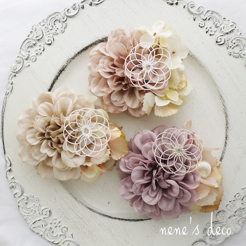 金紛あじさいとキラキラ鞠玉、花水引きが可愛い。はんなりエクリュなダリアの和ヘアアクセサリー。ベビーにも七五三や卒業式の袴にも。パーツが選べる和風髪飾りです。