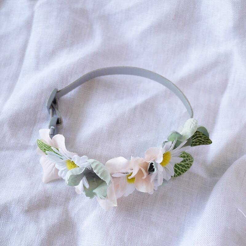 猫・超小型犬の花アクセサリーチョーカー。フレッシュなマーガレットやミントのお花でお作りした、花冠タイプのチョーカーです。猫ちゃんにも安心なペット用の花飾りです。