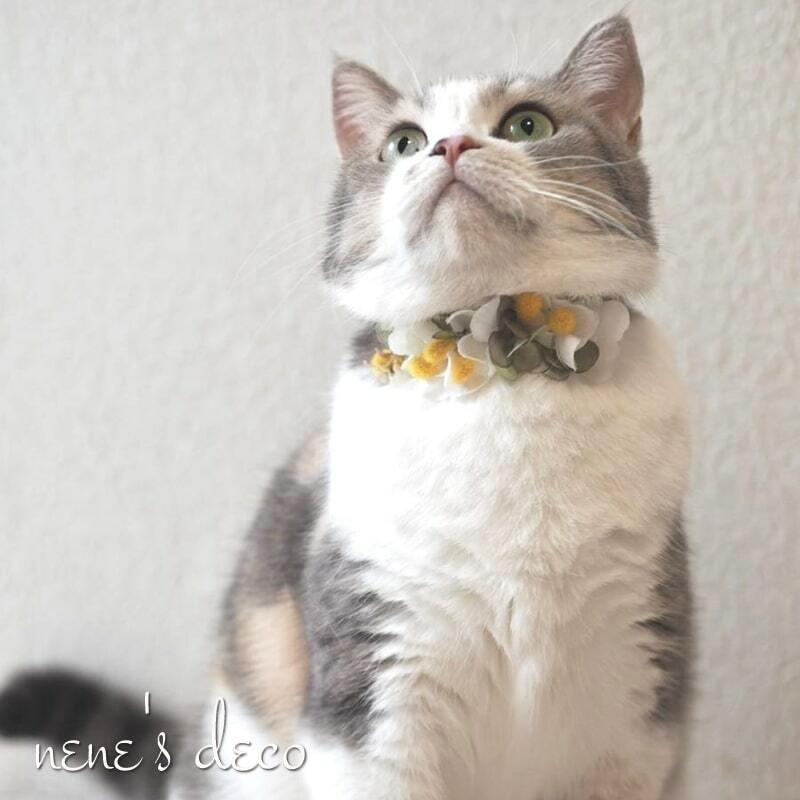 お花畑なナチュラルミモザのお花チョーカー。猫・小型犬・中型犬用での花冠タイプのチョーカー。セーフティー仕様で猫ちゃんにも安心なペット用の花飾りです。