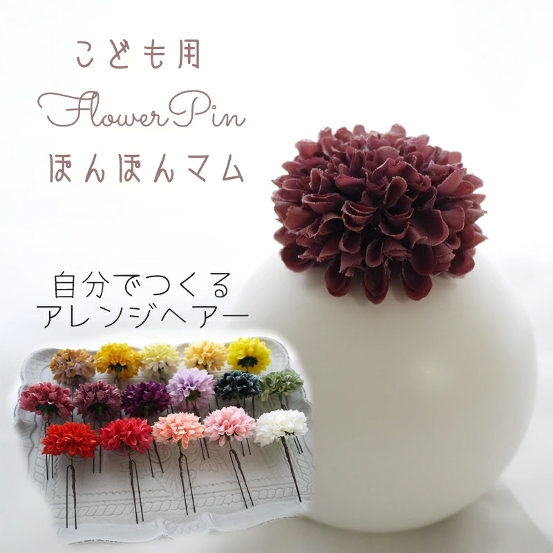子ども 髪飾り DarkMauve ぽんぽんマム(菊) フワラーヘアピン ヘッドドレス(1本) Uピンとかんざしから選べるヘアアクセサリー 7歳 小学生 七五三 子ども