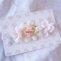 パステルピンクのおしゃれなお花ヘアアクセサリー。新生児からのベビー花ヘアバンド。おひな祭り・お食い初め・初節句、退院や100日祝いのヘアバンドにも。赤ちゃんのおめかしに。