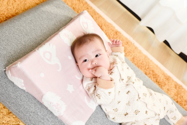 背中から少し頭の位置を上げることで赤ちゃんの吐き戻しや鼻づまりを和らげます。