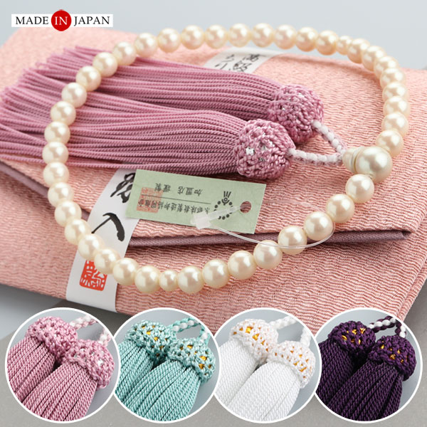 すべての宗派のお客様にお使い頂ける女性用のお数珠でございます。素材は、大人気の貝パールでございます。お手持ちのパールのネックレスなどと合わせてお使い頂けます。今回、房色が4色になりバージョンアップいたしました。ご姉妹、親子で色違いでお持ち頂けます。日本の伝統文化を守る京職人が丹精込めて手作りした証である「京都数珠製造卸組合」タグ付きの安心品質でございます。さらに、お好きなお色をお選び頂けますよう、数珠袋も豊富なカラーをご準備させて頂いております。
