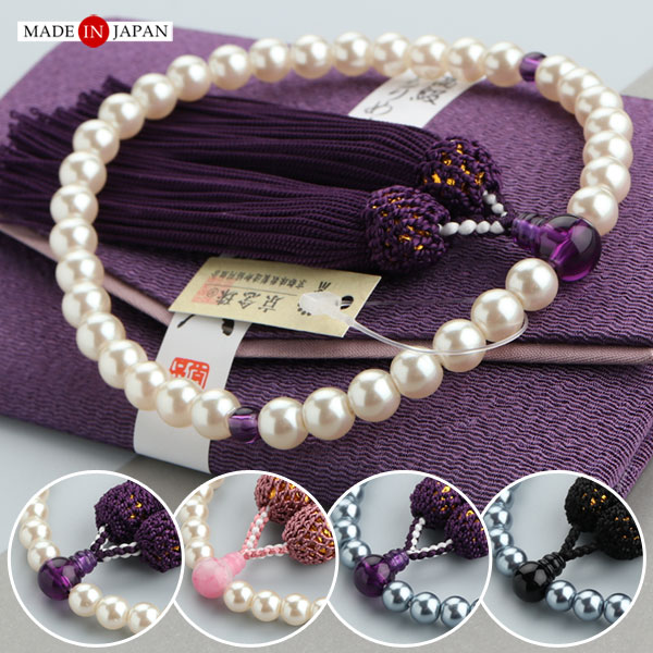 すべての宗派のお客様にお使い頂ける女性用のお数珠でございます。素材は、ガラスを真珠風に加工したハリ真珠でございます。4種類の組み合わせをご準備させて頂きました。ご姉妹、親子で色違いでお持ち頂けます。京都の職人が丹精込めて製作したという証拠である 「京念珠保証タグ付」の安心品質でございますので、安心してお買い求めくださいませ。