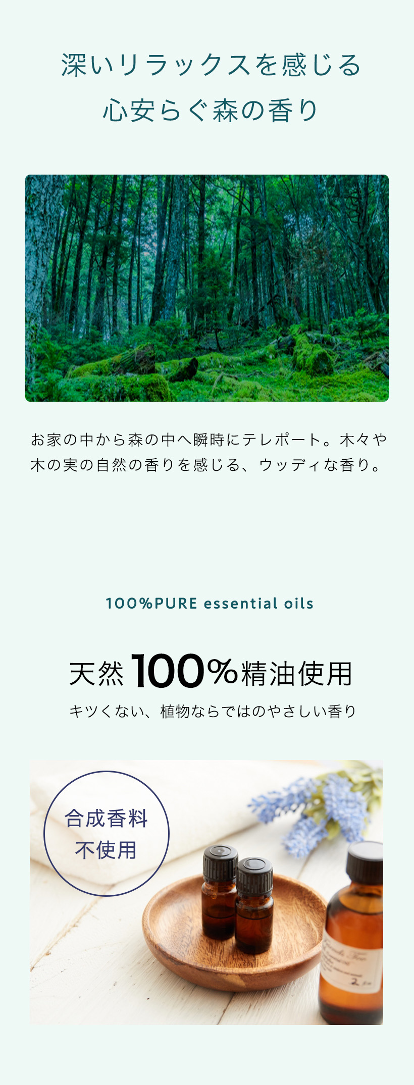 当商品は植物から抽出した天然精油を使用しているため、合成香料の香水やコロンのように長時間持続しません。
