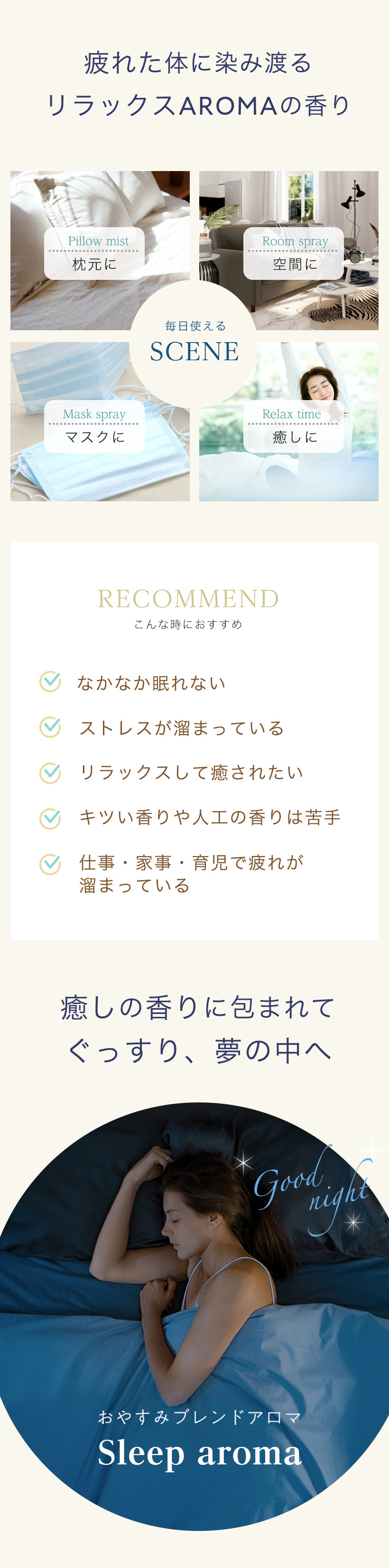 ■使用上の注意:●人体に向けてスプレーしないでください。●絶対に飲用しないでください。●妊産婦、持病をお持ちの方、乳幼児やペット等のいるご家庭では、ご使用前に医師にご相談ください。●マスクや布製品などに着色する恐れがありますので、初めて使う場合は目立たない場所でお試しください。●マスクを装着したままスプレーしないでください。●革製品やシルク等の高価なもの、洗濯できない物には使用しないでください。●目に入らないようご注意ください。●乳幼児やペットの手の届かない所に保管してください。●使用後は、必ずしっかりキャップを閉めてください。●極端に高温、または低温の場所、直射日光の当たる場所には保管しないでください。●火気には十分ご注意ください。●リラックス作用の強い香りは、車の運転や機械の操作等、集中力が必要な場面でのご使用はお控えいただくことをおすすめします。●商品に添付の使用説明書をよく読んでからお使いください。●当該商品は不眠症、睡眠障害を改善する医薬品には分類されません。●植物から抽出した精油を使用しているため、天然の香り成分は数十分程度で全て揮発します。香水やコロンのように長時間持続しません。