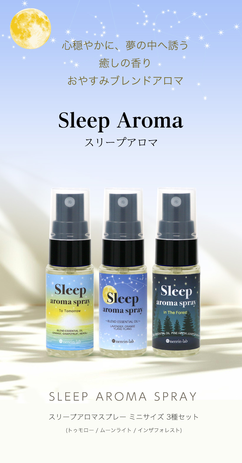 ■セット内容:ネンリンラボ スリープアロマスプレー(moonlight)×1本、スリープアロマスプレー(tomorrow)×1本、スリープアロマスプレー(in the forest)×1本
