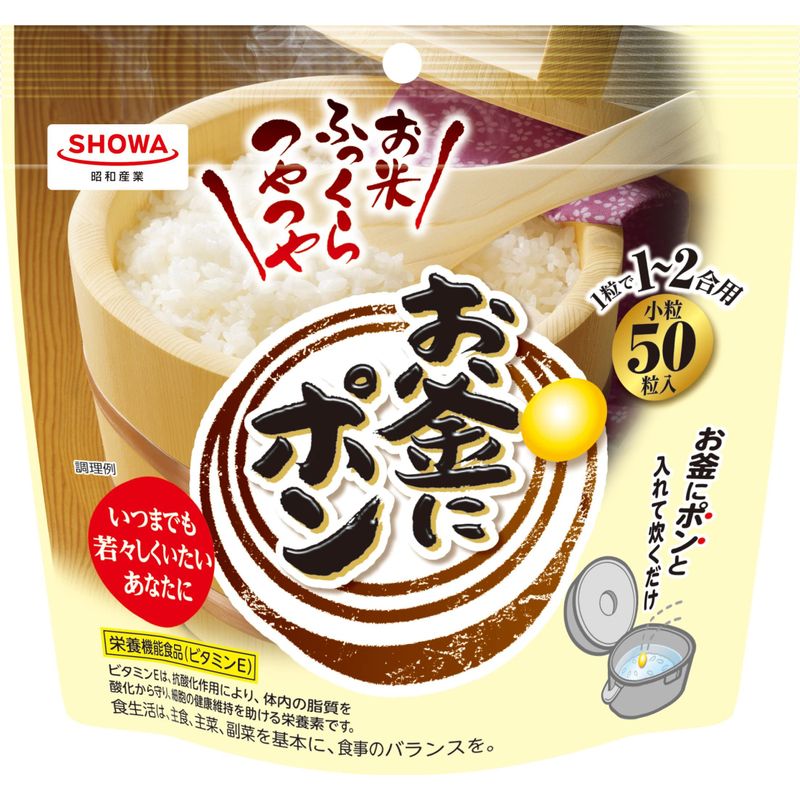 商品紹介 栄養機能性食品(ビタミンE)です。炊飯時にポンと1粒いれるだけ。お米がふっくらつやつや、おいしく炊き上がります。1~2合に一粒が目安です。米1合にお釜にポン1粒使用のご飯1杯分(150g)に、14mgのビタミンEが含まれます。ビタミンEは、抗酸化作用により、体内の脂質を酸化から守り、細胞の健康維持を助ける栄養素です。食生活は、主食、主菜、副菜を基本に、食事のバランスを。 原材料・成分 とうもろこしはい芽油(国内製造)、ゼラチン、小麦はい芽油/グリセリン、抽出ビタミンE