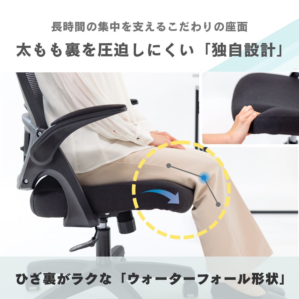 ・足・太ももをサポートするウォーターフォールシート形状座面
