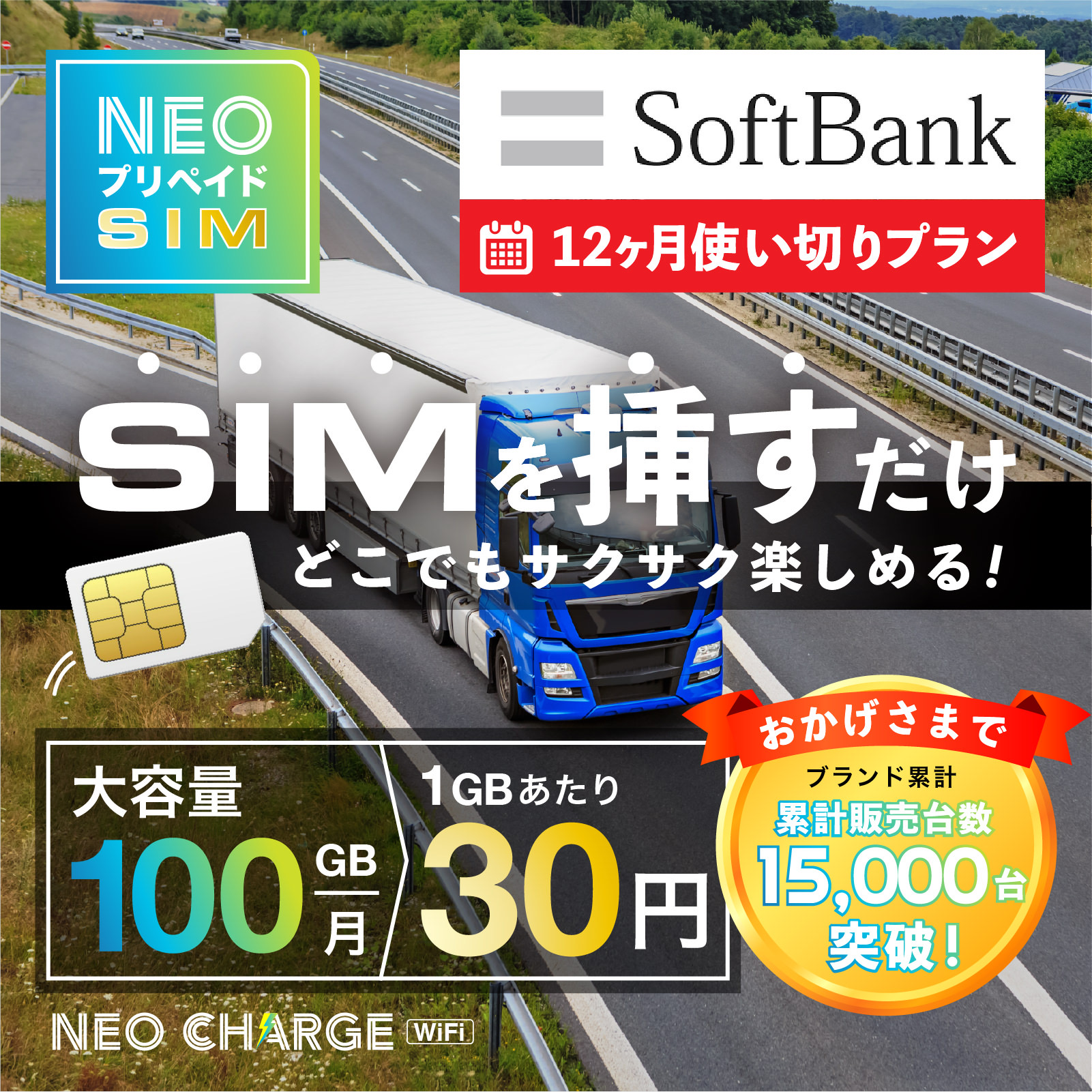 【SoftBank回線】大容量100GB 12ヶ月使い切りプラン 契約不要 月額0円 端末にSIMを挿すだけ 業界最安値に挑戦 格安 プリペイド SIM
