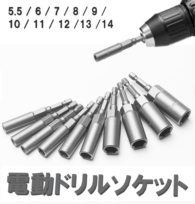 ディープソケット 5.5-14mm 10本 セット 六角軸 差込角 1/4インチ 6.35mm 電動ドリル インパクトドライバー 六角ビット インパクトソケット