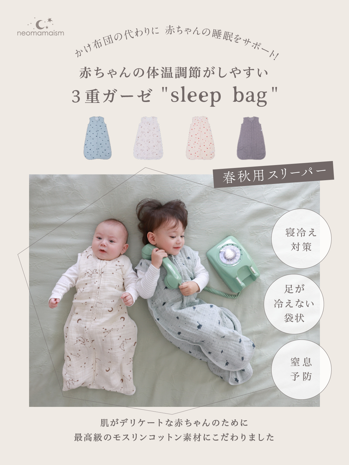 neomamaismの足の出ないスリーパーなら、赤ちゃんの顔に掛け布団がかかる心配もなく、かけ直す心配もないので、日頃頑張っているママやパパも安心して過ごすことができます。