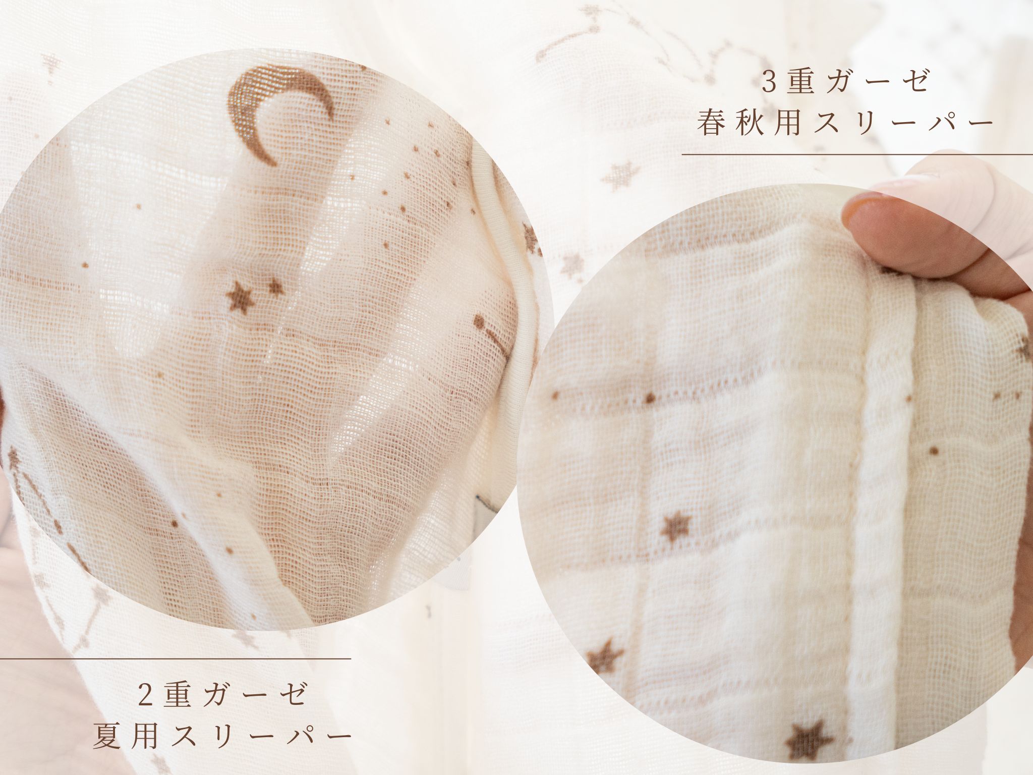 3重ガーゼスリーパーなら、通気性があり熱を逃しながらも程よい保温性で赤ちゃんを守ります。