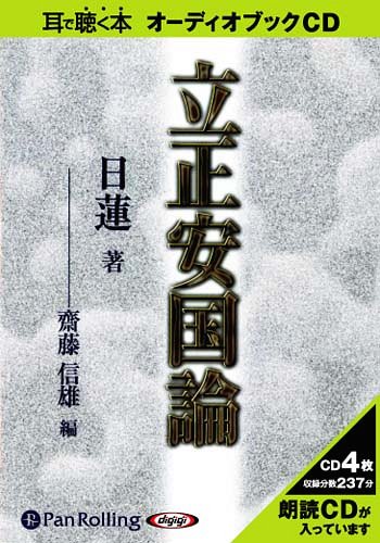 | 【CD枚数・収録時間】 CD 4枚 約237分 危機の時代を生き抜く術!!! 今から700年余り前、危機に直面した日本。そんな困窮した時代に更なる危機を予見し、どう生きるべきか考え抜いた男がいた。 その男の名を日蓮という。そして現代日本の危機―─。21世紀の最初の年、9月11日に起こった現代社会を揺るがしたあの「事件」。憎しみが憎しみを生む“報復”という攻撃の繰り返し。 そんな危機の時代を生き抜く術がここにある!現代語訳と、原文読み下しを収録した「立正安国論」の完全音声版! ※本商品は「立正安国論」(まどか出版刊 斎藤信雄編著 ISBN:978-4-944235-08-7128頁 1,050円(税込))をオーディオ化したものです。 [発行元: でじじ/パンローリング株式会社] |