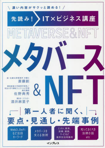 斎藤創/著 佐野典秀/著 酒井麻里子/著/メタバース&NFT 先読み!IT×ビジネス講座 濃い内容がサクッと読める!、メディア:BOOK、発売日:2022/12、重量:340g、商品コード:NEOBK-2807567、JANコード/ISBNコード:9784295015673