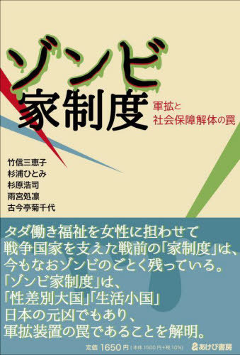 | タダ働き福祉を女性に担わせて戦争国家を支えた戦前の「家制度」は、今もなおゾンビのごとく残っている。「ゾンビ家制度」は、「性差別大国」「生活小国」日本の元凶でもあり、軍拡装置の罠であることを解明。 |