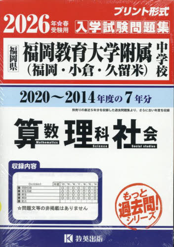 教英出版/福岡教育大学附属中学校 (福岡・小倉・久留米) もっと過去問 入学試験問題集 (2020〜2014年度の7年分) 算数・理科・社会 2026年春受験用 プリント形式のリアル過去問で本番の臨場感! (福岡県)、メディア:BOOK、発売日:2025/05、重量:377g、商品コード:NEOBK-3099081、JANコード/ISBNコード:9784290186996