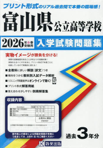 教英出版/富山県公立高等学校 入学試験問題集 2026年春受験用 プリント形式のリアル過去問で本番の臨場感!、メディア:BOOK、発売日:2025/06、重量:500g、商品コード:NEOBK-3104943、JANコード/ISBNコード:9784290187177