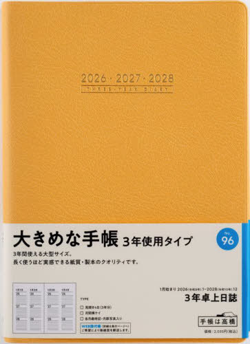 | ■■■丈夫で開きやすい製本。日々の日記にはもちろん、長期的なプロジェクトにも活躍。■■■ [連用ダイアリー シリーズ]日々の日記にはもちろん、長期的なプロジェクトに携わるビジネスマンにもオススメ。丈夫で開きやすい製本です。 元気のでるオレンジカラーが特徴の3年分の記録を書き込める連用ダイアリー。横ケイ式の月間ページは3年分の予定が一覧でき、ビジネスや年間行事などの管理に役立つ一冊です。 ★月間ページ★ 長期プロジェクトを管理しやすい見開き1ヵ月×3年分の横ケイ式カレンダーは、年ごとのスケジュールの比較に便利。左側にはフリーのメモスペース付きです。 ★週間ページ★ 1年前、2年前の今日は何をしていたか、一目瞭然の3年対比。年ごとの比較や長期計画の立案に役立ちます。 ★商品詳細★ 【月間ページ記入形式】横ケイ式 【日付ページ記入形式】連用 【サイズ】A5判(縦:210mm×横:148mm) 厚さ:19mm 重さ:490g 【掲載期間】月間:2026年1月1日〜2028年12月31日 日付:2026年1月1日〜2028年12月31日 【ページ数】304 【付録】 <本文>・年齢早見表・非常時への備え・手紙の慣用句・3年間の記録・方眼メモ<別冊>・横ケイメモ・方眼メモ・切り取りメモ <別紙>なし WEB付録:有 |