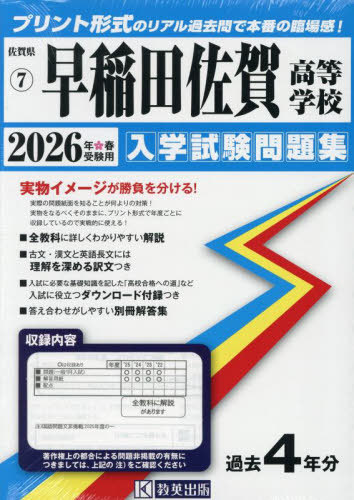 教英出版/早稲田佐賀高等学校 入学試験問題集 2026年春受験用 プリント形式のリアル過去問で本番の臨場感! (佐賀県 入学試験問題集 7)、メディア:BOOK、発売日:2025/08、重量:500g、商品コード:NEOBK-3125697、JANコード/ISBNコード:9784290183285