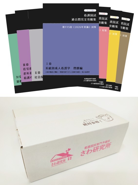 | ※2026年度実施試験向けの最新版です ※本商品は新品です。中古品ではありません 実習も国試もこの1冊で! 【さわ研の黒本が選ばれる6つの理由】 1. 黒本には豪華な特典が満載! ・掲載問題約3,700問中300問に解説動画付き!――正答率の低い問題や、学生の皆さんからよく質問される問題を1問ずつ解説します。 ・黒本購入者限定 マンスリー講座付き!――黒本ご購入者限定の国試対策講義を無料で視聴できます。配信月ごとに視聴することで継続的な学習を行うことができます。(5月〜12月にかけて月に1回、1コマ45分×3コマの講義を配信いたします) 2. 第83回から第114回までの良問や重要な問題を約3,700問掲載! 看護師国家試験では、過去に出題された問題が繰り返し出題される傾向があります。このため、過去問題を解くことで、国試に直結する知識を効果的かつ効率的に吸収することができます。「なぜ3,700問も載せているのですか?多すぎませんか?」と質問をいただくことがありますが、多くの過去問題に触れ、解くことで自然と暗記できます。1日20問ずつ解いて約半年、早めのスタートを切ることこそ国試合格への最大の近道です。1日でも早く取り掛かり、国家試験合格をつかみ取りましょう! 3. 薄くて持ち運びに便利な7領域13分冊! 持ち運びに便利なよう分冊にしています。領域により1冊の厚みは異なりますが、例えば母性の問題編は約400問の掲載がありながら約4mmの薄さならの、実習の際にも持ち歩くことができます。また、問題編と解答編が別冊であるため、試験感覚で集中して問題を解くことができ、解説を横に置いて確認しながら学習することができます。(2章の社会保障制度は問題編と解答編を1冊にまとめています) 4. 疾患ごろに問題を掲載。繰り返し解くことで苦手克服! 国家試験では疾患について色々な角度から出題されます。ひとつの疾患に対して類題をまとめて掲載する「トレーニング式」を取っている黒本なら、疾患について様々な例に触れることができます。例えば、「統合失調症」については状況設定問題が15事例45問掲載されています。つまり、15人の統合失調症の患者さんの症例を学習できるということです。多くの例に触れることで疾患自体への知識、病態や看護など、多角的な知識が得られます。実習で受け持つ患者さんに該当する疾患や症状の問題を黒本で連続して解くことで、国家試験に向けての勉強と実習準備とを両立することが可能です。 5. 正答率を掲載! 黒本では第104回以降の問題に正答率を掲載しています。約1万人の受験生のデータを分析した正答率を記載してあるため、客観的に難易度がわかるのはもちろん、落とせない問題がどれなのかひと目でわかります。他の受験生と比べて自分は何が苦手なのか、あるいは得意なのか、学習におけるひとつの指針にすることができます。 6. 重要箇所はPoint!で詳しく解説! 黒本は表やイラストを交え詳しくポイントを解説します。解説には超重要ポイントが詰まっていますので、「何が国試で大事なのか」がひとめで分かります。 |