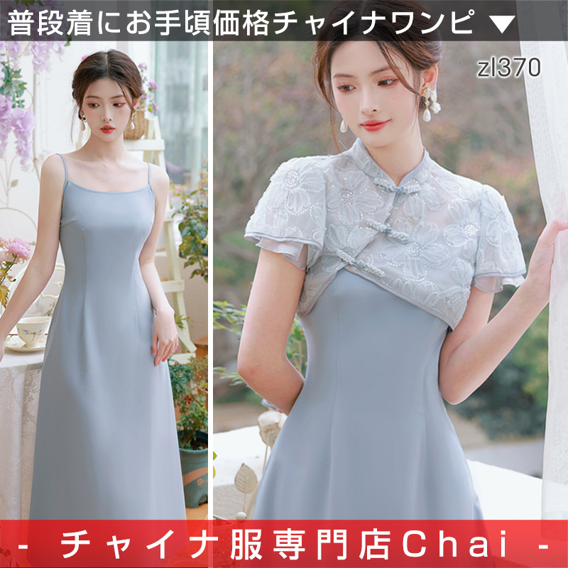 チャイナドレス ★chaiはポイント最大3倍★ チャイナ服 ワンピース 半袖 ブルー 花柄 セパレートセット 上品な風合い ロング丈 普段着 二胡衣装 旗袍 zl370