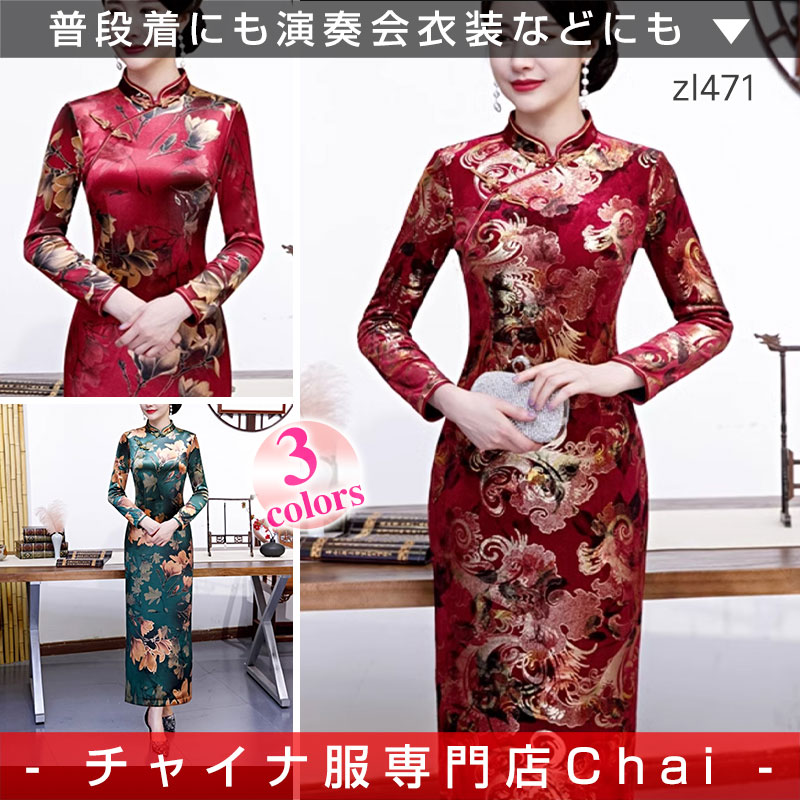 チャイナドレス チャイナ服 ★chaiはポイント最大3倍★ ワンピース 花柄 高級感 エレガント ロングワンピ 上品な風合い 長袖 ロング丈 チャイナ風ワンピ zl471