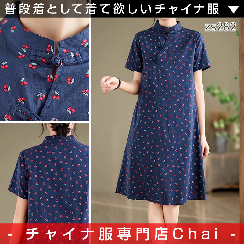 チャイナドレス チャイナ服 ★chaiはポイント最大3倍★ ワンピース ひざ丈 半袖 小さなチェリー柄 さくらんぼ柄 モダン Aライン チャイナ風ワンピ zs282
