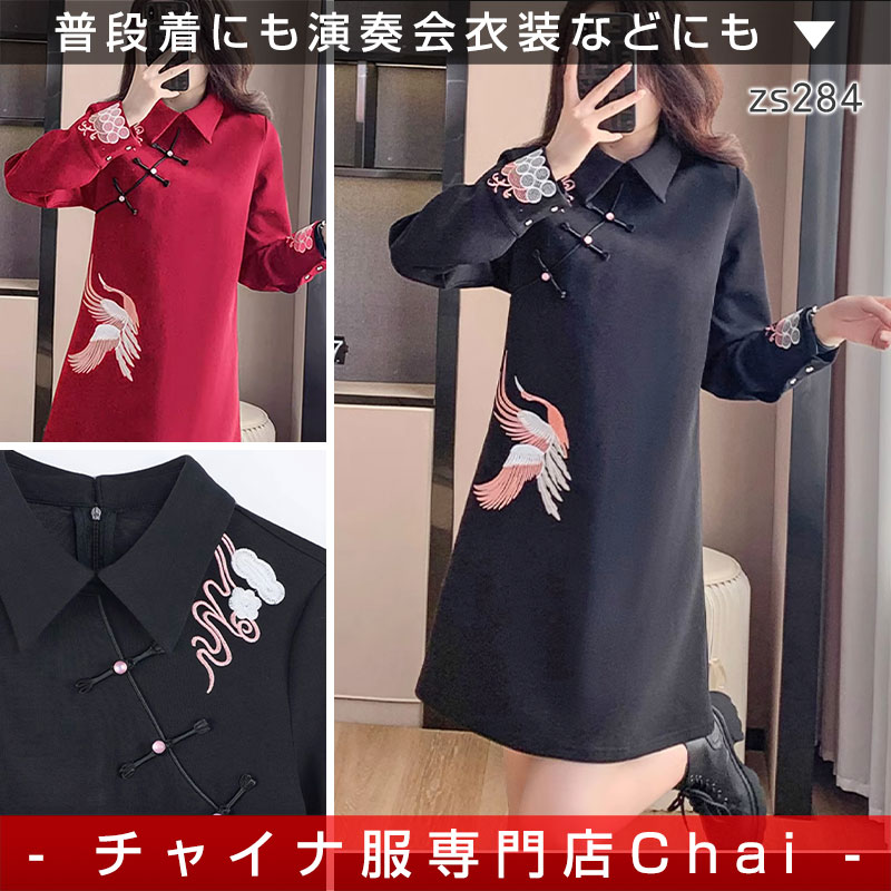 チャイナドレス チャイナ服 ★chaiはポイント最大3倍★ ワンピース ショート丈 長袖 モダン 刺繍 可愛い チャイナ風ワンピ zs284