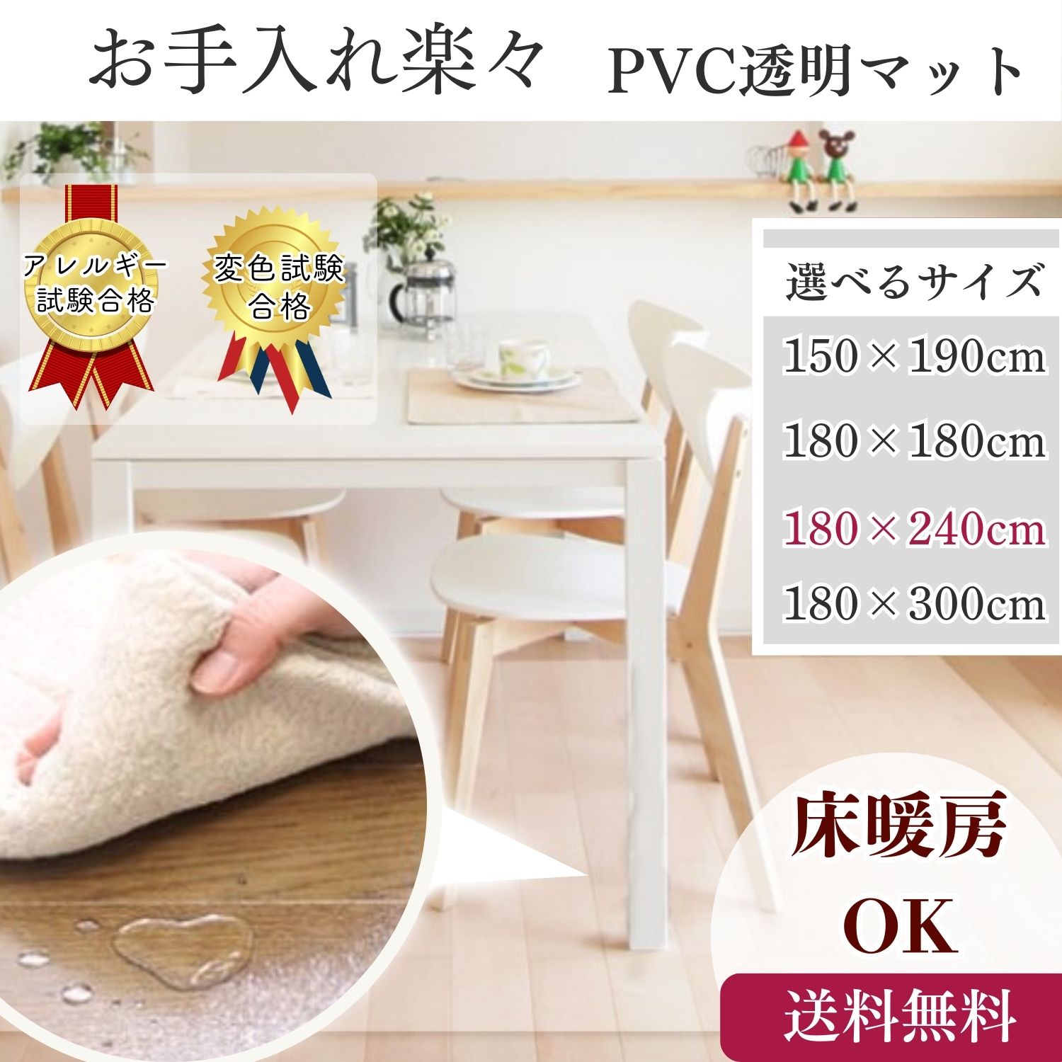ダイニングマット 拭ける フロアマット クリア 180×240cm 抗菌 防臭 防カビ 厚1.5mm 床 保護 傷防止マット 撥水 透明 テーブルマット クリアマット