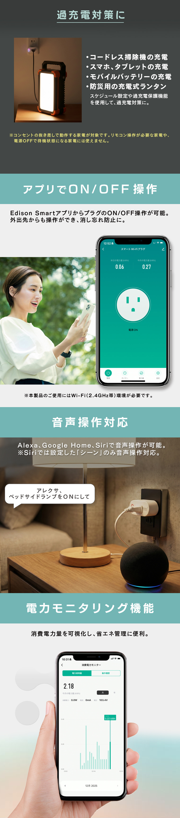 POINT 1|スマホ・音声で電源オンオフ古い家電もかんたんスマート化!専用の「Edison Smart」アプリから、外出先でも家電のオン・オフ操作が可能。