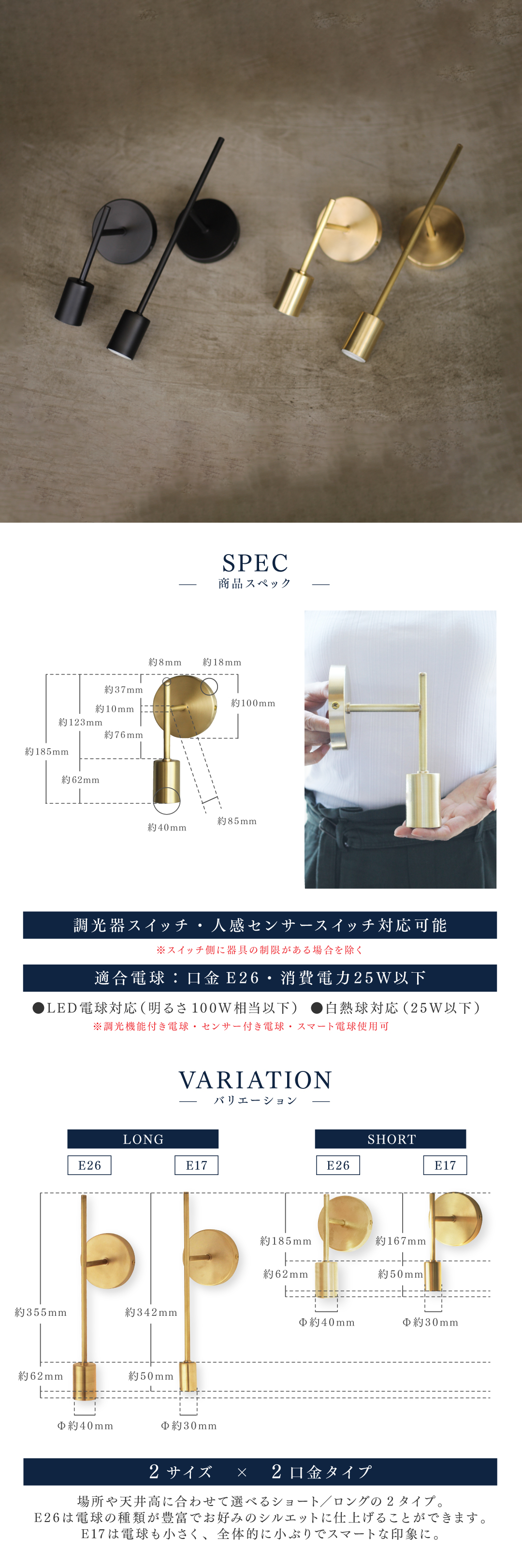 | 仕様 | 口金:E26 定格電圧:AC100V 対応電球:LED電球・白熱電球 消費電力25Wまで 取り付け方法:壁付け ※壁付け専用照明器具です(埋め込み配線)。取付けは必ず電気工事店にご依頼ください。 ※照明器具にはスイッチは付いておりません。壁スイッチをご使用ください。 ※電球は付属しておりません。 |