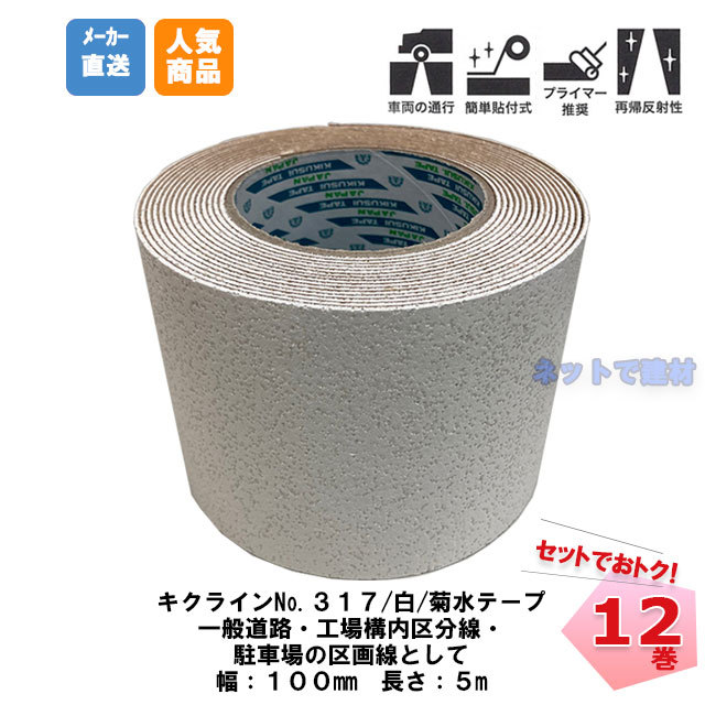 キクラインテープ No.317 100mm幅×5m 白色 菊水テープ 12巻 (1箱) まとめ売り 貼付 道路 駐車場 路面標示用 合成ゴム 反射ビーズ 道路 駐車場 プロ仕様 舗装 屋外 路面 安全 区画整理 横断歩道 工事用 施工 工場区分線 バラもあります