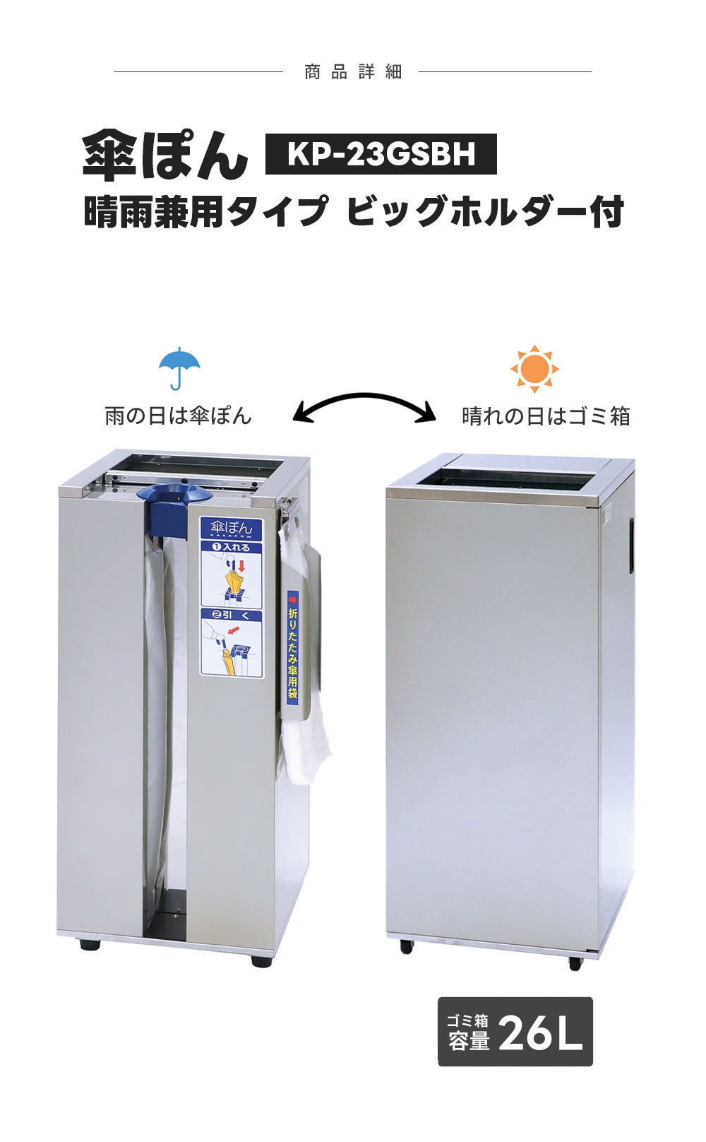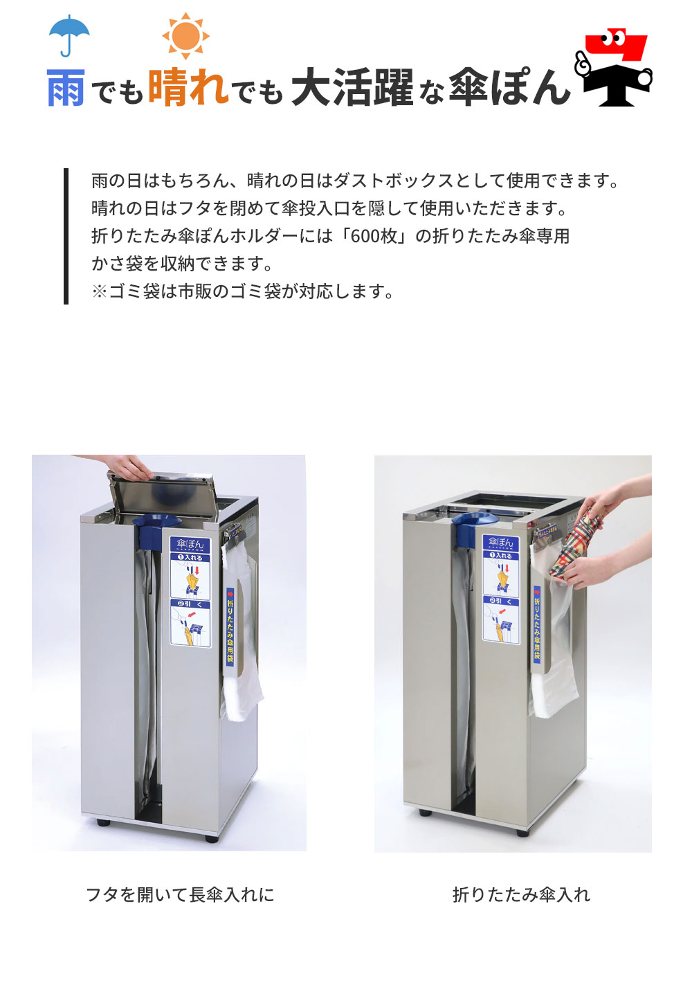 ・雨の日はもちろん、晴れの日はダストボックスとしても使用できる「傘ぽん」です。