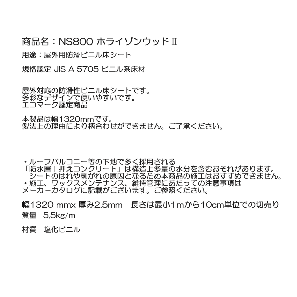 屋外用防滑ビニル床シート NS800 132巾 ホライゾンウッド2 10cm単位カット販売 東リ 幅1320mm 厚み2.5mm エコマーク認定商品 個人宛配送不可